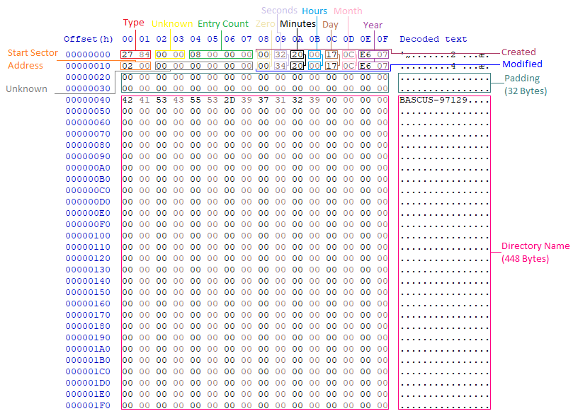 The first entry must be a directory with the name of the file, such as BASCUS-97129. The entry count is the number of directories and files within this .psu file. The Type value states it is a directory when the value is 0x8427. The structure of the directory entry is shown below: