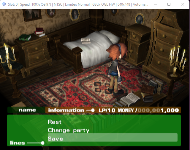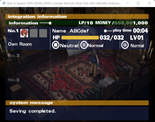 Once the game was booted, I created a new profile with the name “ABCdef”, progressed through the dialog and then navigated to the characters bedroom which allows you to save the game to the memory card.