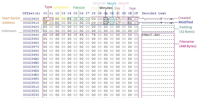All subsequent entries are files with a Type of 0x8497 and can be exported to a standalone file. Each entry contains a header followed by the content of the files. If the file content length is not a multiple of 1,024, then padding bytes are appended to the end of the file contents until the length is a multiple of 1,024. The following structure shows a single file entry: