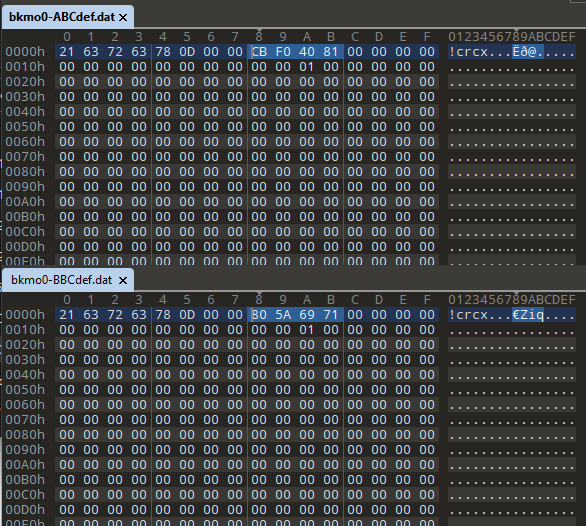 As shown, the profile name has a different first letter as expected, however four other bytes have changed at offset 0x08. You may have noticed the string “!crc” at the start of the file which gives us an indication that the value at offset 0x08 is a CRC value.