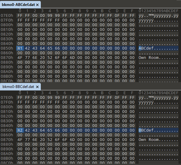 To determine the problem, I created a new save game with the profile name “BBCdef”, and extracted the bkmo0.dat file. I then performed a hex diff to see what data in the file was different in the two profile files.