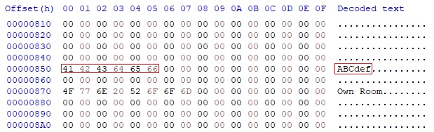 After exporting the save game files from BASCUS-97129.psu using pypsu, I searched the exported files for the ASCII text “ABCdef” as that was the name I used when creating the profile. This string was found at offset 0x850 in bkmo0.dat as shown below: