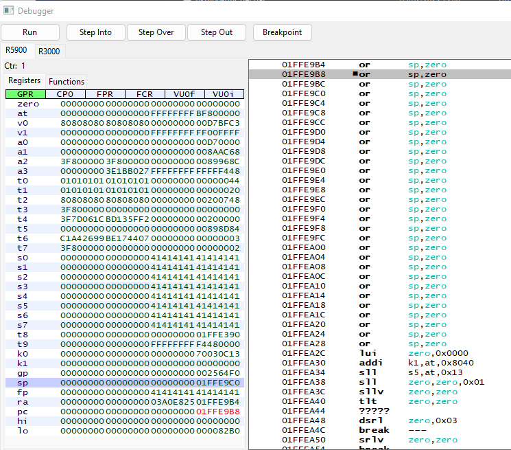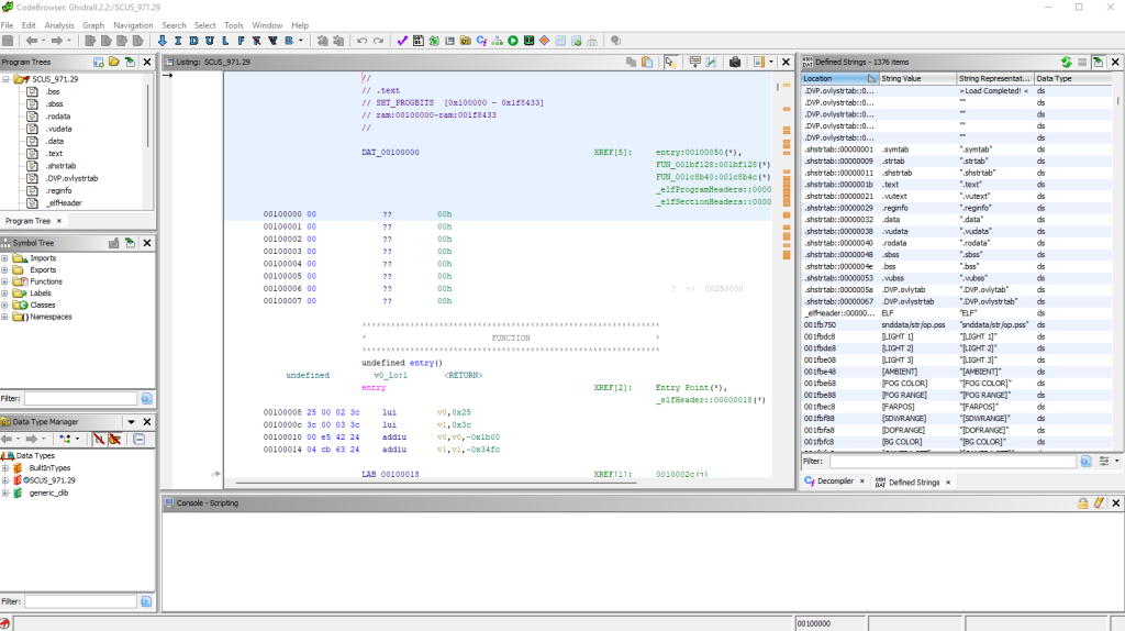 I used the Ghidra plugin beardypig/ghidra-emotionengine with Ghidra version 9.2.2 to load the game binary SCUS_971.29: