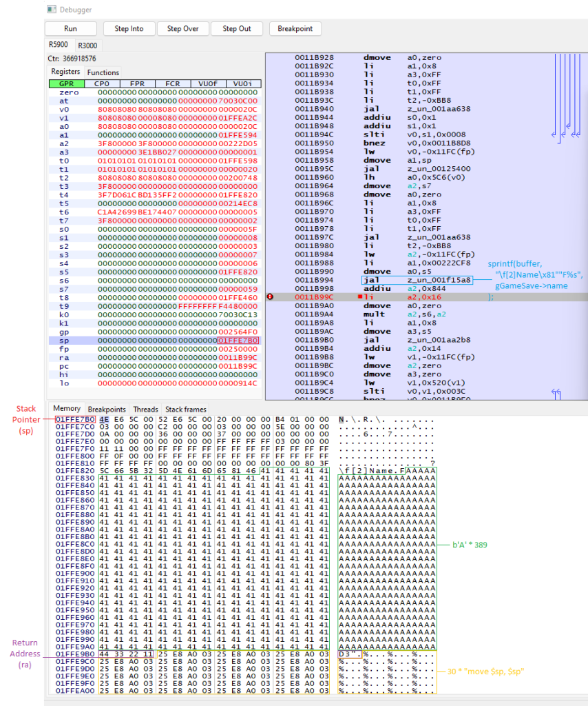 In the previous post, we obtained a game save file and managed to import and export files from the PSU file format. In this post, we begin by editing the profile name, which requires calculating a cyclic redundancy check (CRC) value. We then develop a traditional stack buffer overflow exploit by overflowing the profile name within the save game file. Finally, we write a small amount of MIPS assembly code to load a PlayStation 2 ELF file into memory and then execute it.