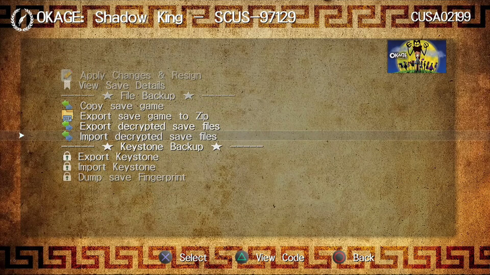 Once you have a game save file on your PlayStation 4, open Apollo PS4, choose “HDD Saves”, select “OKAGE: Shadow King – SCUS-97129”, then select “Export decrypted save files” and finally click “VCM0.card”. This will save the existing memory card file to /data/apollo/<user-id>/CUSA02282_SCUS-97129/VCM0.card.