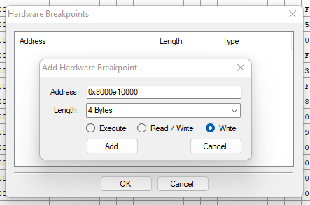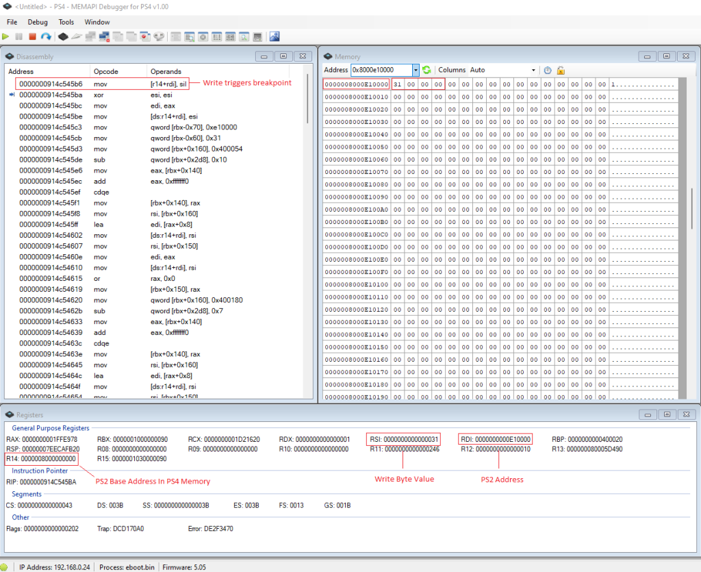 First we connect the debugger to the PlayStation 4 and attach to the eboot.bin process. Next, we set a hardware write breakpoint on the address 0x8000e10000 which is the PlayStation 4 memory address of the PlayStation 2 memory address.