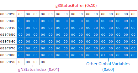 We are now able to overflow the gSStatusBuffer (0x0897820) and corrupt global values directly beyond the buffer. After 0x60 bytes of other global variables, we can overwrite the gNStatusIndex (0x0897890) variable to any unsigned 32-bit integer as shown in the following memory dump: