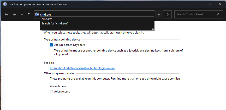 With the On-Screen Keyboard back, we can click in the search bar and type “cmd.exe”.